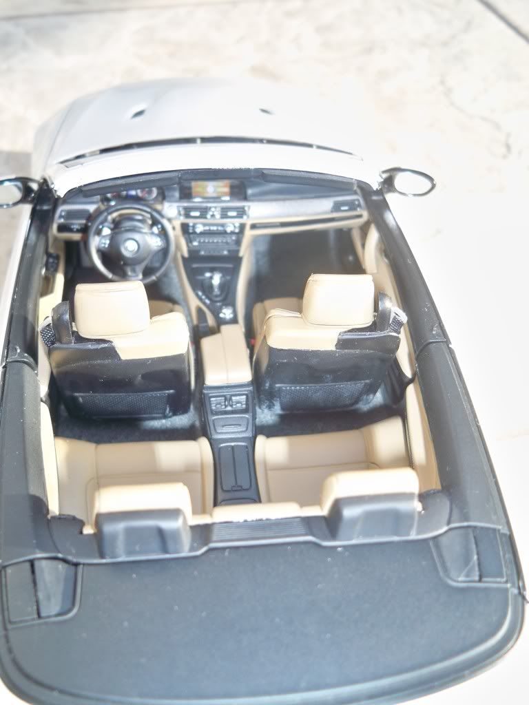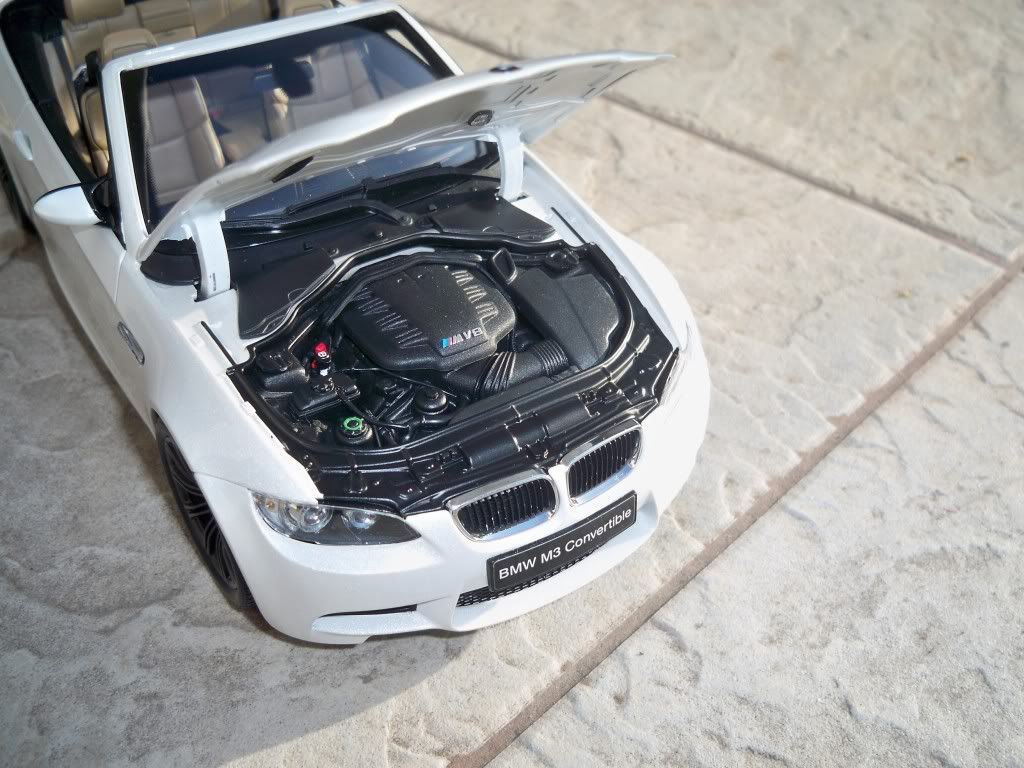 Interior:interiorul este ca de obicei realizat impecabil,specific modelelor Kyosho,butoanele sunt realizate in relief,scaunele la fel,pragurile cu sigla M3,volanul reprezentat si el foarte bine,insertiile de carbon prezente pe bord si in interiorul machetei,centuri din material textil,interiorul si portbagajul mochetat.In portbagaj se afla de asemenea si fasie din material textil care ajuta la tragerea plafonului retractabil.